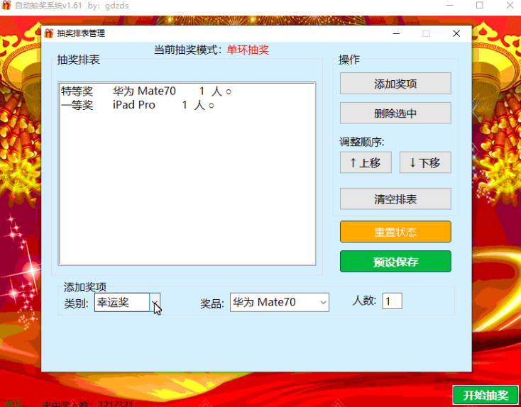2、支持单次循环和预设顺序两种抽奖模式:预设时每次确认都会按设定顺进行抽奖,抽完会提示完成。前提要选择对应模式才会执行。