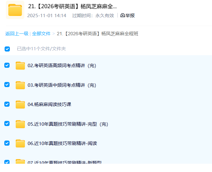 该资源为2026考研英语杨凤芝麻麻全程班课程资料,包含多个模块:文件模块有完形、阅读、写作、翻译、新题型等各题型精讲讲义及考研英语进阶词、抢分词、写作替换词等词汇资料;考研英语学习指南模块有1个学习指南视频;高频词考点精讲模块有428个高频词list视频;中频词考点精讲模块有152个中频词list视频;杨麻麻阅读技巧课模块有18个阅读技巧视频;近10年真题技巧带刷精讲模块包含完型(10个视频)、阅读(42个视频)、新题型(11个视频)、翻译(11个视频)各题型真题讲解视频;英语写作模块有12个写作相关视频。